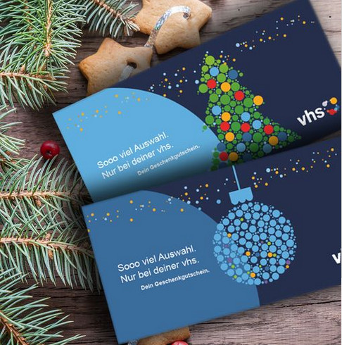 Wer dem Weihnachtstrubel entgehen und dennoch ein sinnvolles Geschenk machen möchte, ist bei uns richtig. Unsere vhs-Gutscheine im weihnachtlichen…